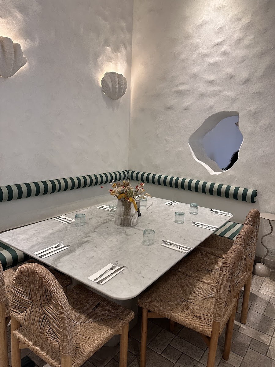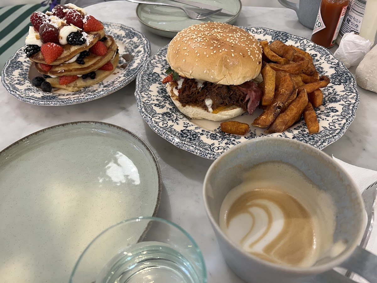 This is wow – food, beverages, style, service level! Interior: To me the venue had mid-century vibes combined with Greek vibes in the centre of Paris. So much architectural atmosphere in one place. I like. I mean look at the tiles in the bathroom area with some Mediterranean influence to them. Then the chairs with rattan elements. Take the glass block counter. The mussel lamps. The white blue marquee spanning the outdoor area. Food: We had plain dishes with avocado, salmon, scrambles egg toast, fries. Our drinks: water, flat white (beautiful and delicious), freshly made amber juice. All very good. A wise chef once said: also simple dished are deserved to be made with love and patient. Yep, that I could feel there. Service experience: Very kind, attentive. We don’t speak any French besides a “Merci” and “désolé”. I was there with my wife, au-pair and 20 month old daughter. It was very busy, only 2 tables vacant when we entered around 1200 at noon. Our table was located pretty much in the centre of the room. Yet it was not a problem what so every that we sat down in peace and even had the stroller next to our table for some minutes to unpack and get set up. We swapped the stroller for a kid chair. All with kidness and helpfulness from the staff. Definitely worth a visit. PS: One recommendation from the bottom of my heart. Take taxi, tram, train or whatever to Paris. But do not venture out with the car into the city centre praying for a parking spot to show up. In the end we were lucky with our VW bus – we got a parking spot by the side of the road. With the car being 200cm in height we didn’t fit in any underground parking lot.