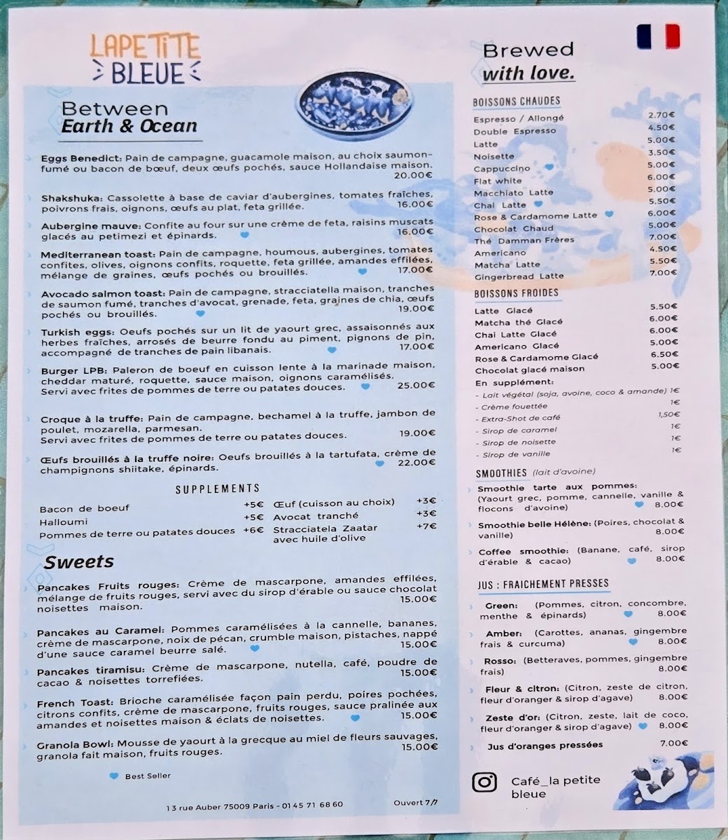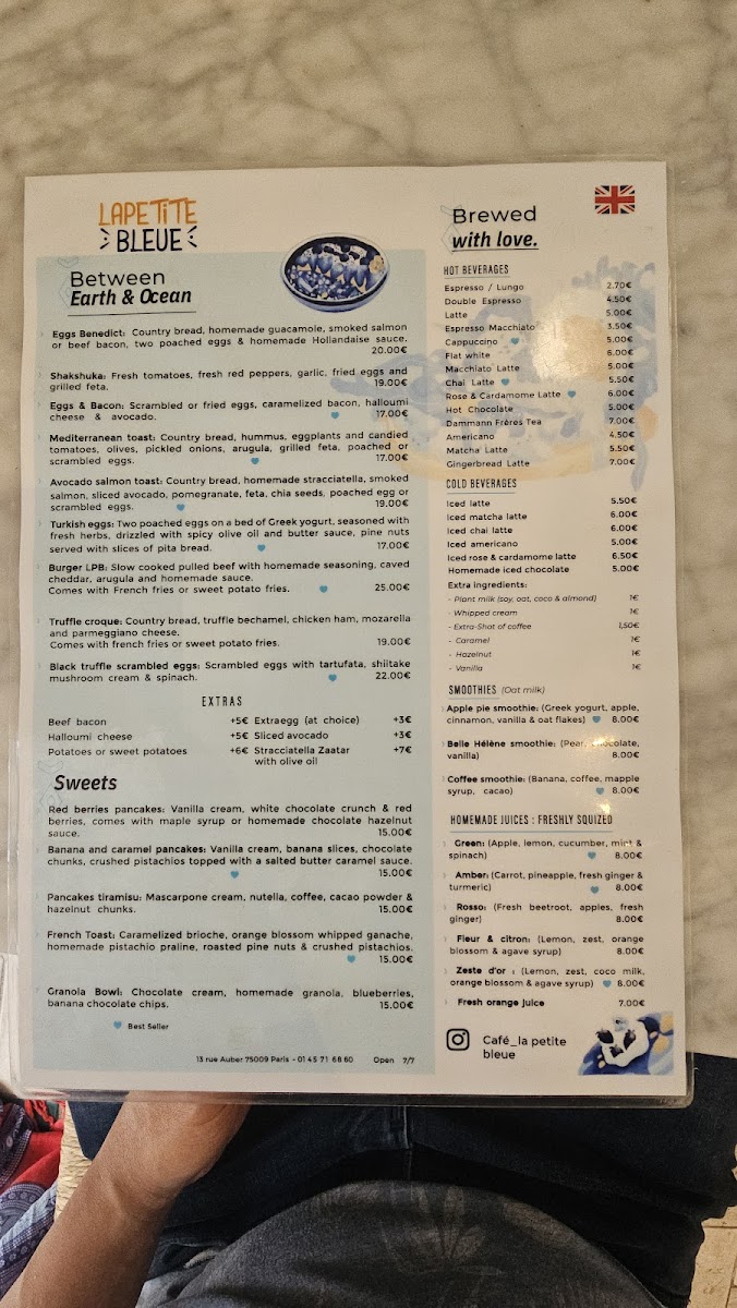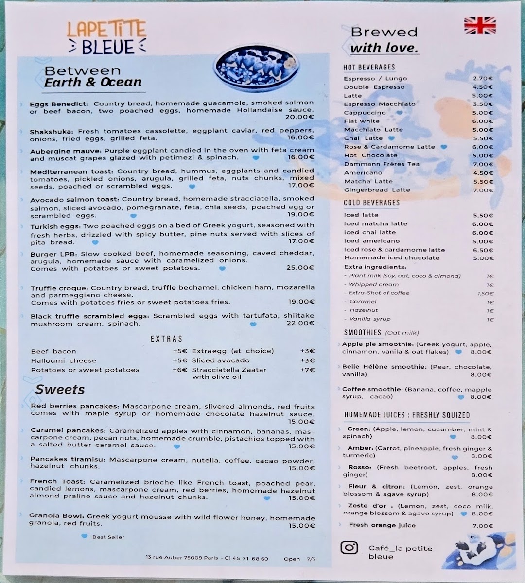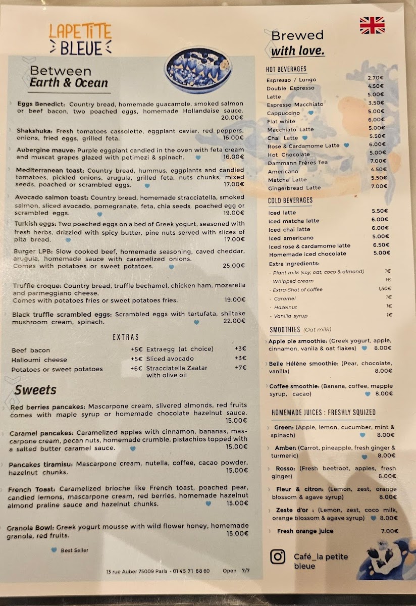 La Petite Bleue, nestled in the charming Rue Auber, is a brunch haven in Paris that perfectly captures the essence of French culinary delight. This inviting restaurant boasts a menu that fuses traditional flavors with a Mediterranean twist. Signature dishes like the Benedict Eggs, featuring poached eggs atop artisanal bread with a choice of smoked salmon or beef bacon, exemplify their brunch philosophy—simple yet exquisite. The Shakshuka, rich in spices and topped with feta, offers a savory kick, while pancakes with fresh berries and mascarpone provide a sweet finish that’s not overly indulgent. Diners rave about the delightful ambiance and friendly service, making it a popular spot for both locals and tourists. Although the prices may lean towards the higher side, the flavorful experience, artful presentation, and inspiring coffee make La Petite Bleue a must-visit for any brunch enthusiast in Paris.