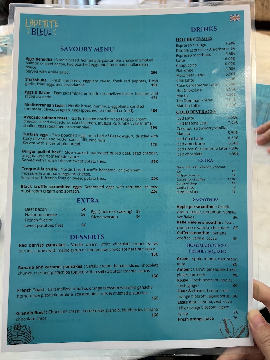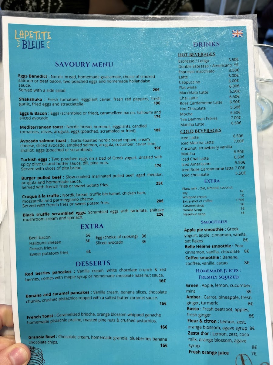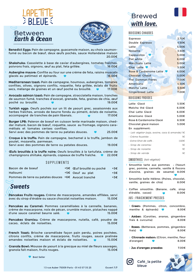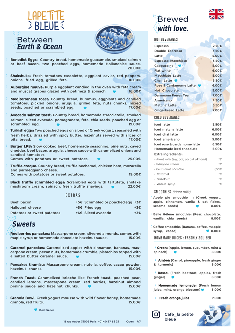 La Petite Bleue, nestled in the charming Rue Auber, is a brunch haven in Paris that perfectly captures the essence of French culinary delight. This inviting restaurant boasts a menu that fuses traditional flavors with a Mediterranean twist. Signature dishes like the Benedict Eggs, featuring poached eggs atop artisanal bread with a choice of smoked salmon or beef bacon, exemplify their brunch philosophy—simple yet exquisite. The Shakshuka, rich in spices and topped with feta, offers a savory kick, while pancakes with fresh berries and mascarpone provide a sweet finish that’s not overly indulgent. Diners rave about the delightful ambiance and friendly service, making it a popular spot for both locals and tourists. Although the prices may lean towards the higher side, the flavorful experience, artful presentation, and inspiring coffee make La Petite Bleue a must-visit for any brunch enthusiast in Paris.
